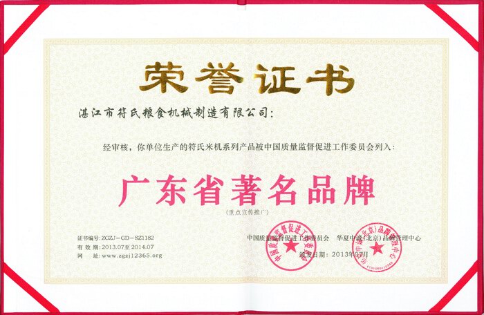 2 2013年被授予“符氏米機系列產品被中國質量監(jiān)督促進工作委員會列入:廣東省著名品牌”榮譽證書