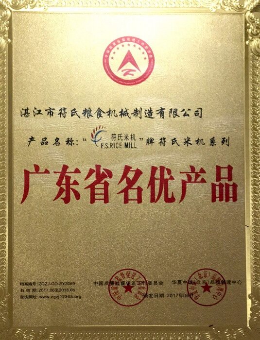 1 2017年產品名稱符氏米機F.S. RICE MILL符氏米機牌系列被授予“廣東省名優(yōu)產品”榮譽牌匾